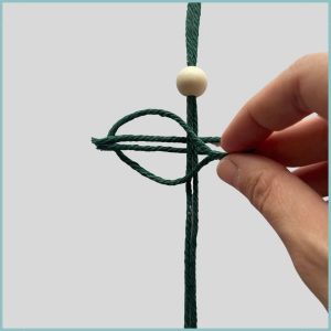 Falte eine weitere kurze Schnur. Lege die Schlaufe nach rechts und führe die losen Enden der vorherigen Schnur hindurch. Ziehe dann die Enden der neuen Schnur durch die Schlaufe der darunterliegenden.